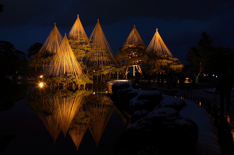 恒例のライトアップ。冬は金沢の冬の風物詩・雪吊りの景色を楽しめます。